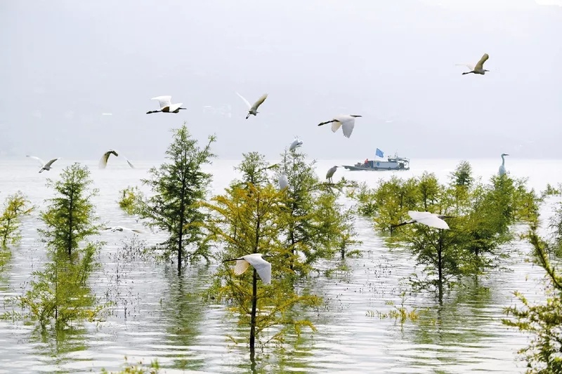 人民法院認真貫徹落實習近平生態(tài)文明思想,努力為生態(tài)文明建設與綠色發(fā)展提供優(yōu)質(zhì)司法服務。在長江三峽庫區(qū),為解決庫區(qū)消落帶植物存活的治理難題,重慶法院引進了耐淹耐旱的中山杉。圖為重慶法院長江三峽庫區(qū)生態(tài)修復司法保護示范林的中山杉在水庫蓄水時被部分淹沒的景象。最高人民法院供圖