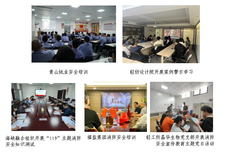 二是消防知識大學(xué)習(xí)。全系統(tǒng)上下組織開展消防安全知識培訓(xùn),以案為鑒強(qiáng)警示,敲響警鐘保安全。公司本部將消防宣傳月要求納入中心組學(xué)習(xí),圍繞“強(qiáng)化安全生產(chǎn)責(zé)任落實(shí) 有效防范化解各類安全風(fēng)險(xiǎn)”主題開展交流研討;青山紙業(yè)邀請福州民安消防有限公司高級講師開展了11場次的消防安全拓展培訓(xùn);海峽融合組織開展“119”主題消防安全知識測試;福鹽集團(tuán)、輕紡設(shè)計(jì)院、輕工所、金皇物業(yè)等組織專題培訓(xùn),傳達(dá)學(xué)習(xí)省政府、福建輕紡關(guān)于開展2023年消防宣傳月活動(dòng)的通知精神及《消防法》等法律法規(guī),組織人員觀看消防安全警示教育片和典型火災(zāi)事故案例,切實(shí)增強(qiáng)廣大員工消防安全意識。