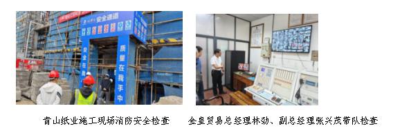 六是消防隱患大排查。進(jìn)一步壓緊壓實(shí)消防安全責(zé)任,將消防宣傳月活動(dòng)與鞏固深化消防安全重大風(fēng)險(xiǎn)隱患專項(xiàng)排查整治行動(dòng)相結(jié)合,組織排查整治各類安全隱患。福建輕安組織對本部、消防重點(diǎn)項(xiàng)目(青山紙業(yè)、山東魯麗木業(yè))進(jìn)行消防隱患重點(diǎn)排查,持續(xù)強(qiáng)化全鏈條安全隱患排查整治;金皇貿(mào)易領(lǐng)導(dǎo)帶隊(duì)前往消控室、機(jī)房、停車場等消防安全重點(diǎn)部位,認(rèn)真仔細(xì)開展安全檢查工作,及時(shí)、妥當(dāng)處理潛在安全風(fēng)險(xiǎn)隱患。