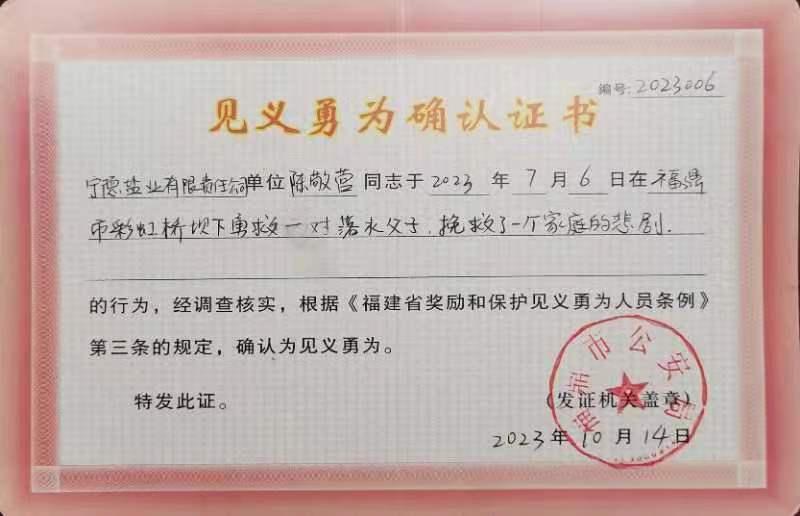 陳敬營同志7月6日晚8時(shí)左右因勇救落水群眾事跡被寧德鹽業(yè)黨支部授予“見義勇為員工獎(jiǎng)”,并在省國資委、福建輕紡、福鹽集團(tuán)網(wǎng)站進(jìn)行宣傳報(bào)道弘揚(yáng)學(xué)習(xí)。經(jīng)寧德鹽業(yè)公司積極申報(bào),公安部門調(diào)查取證,福鼎市公安局于10月14日向陳敬營同志頒發(fā)了“見義勇為確認(rèn)證書”(證書編號2023006)。