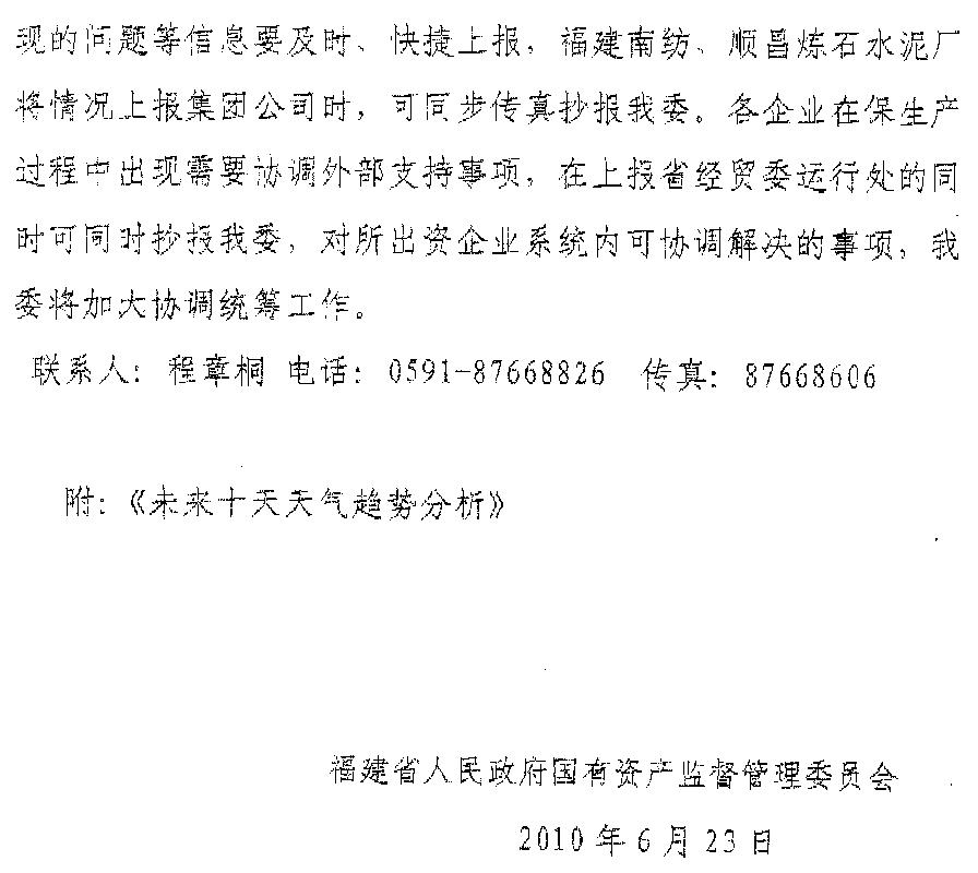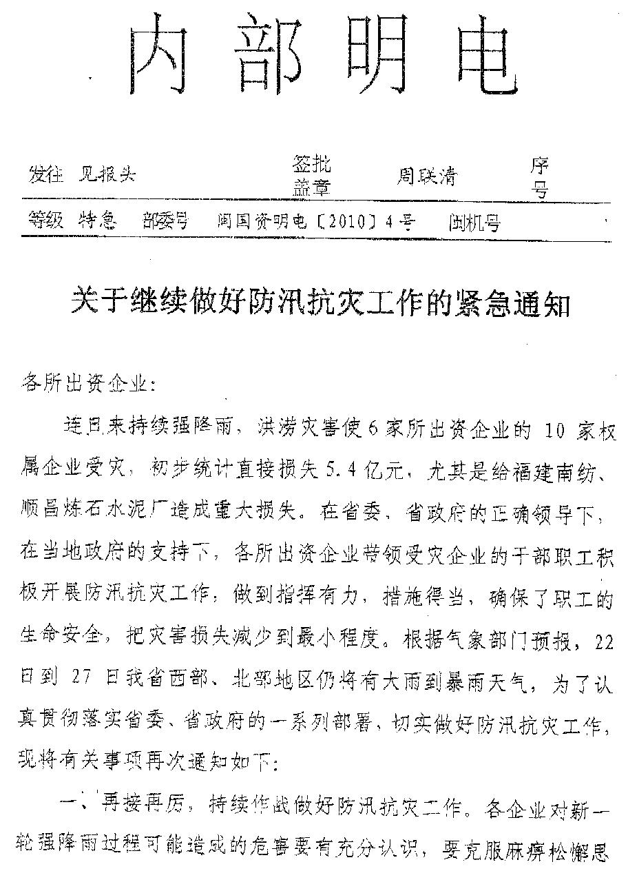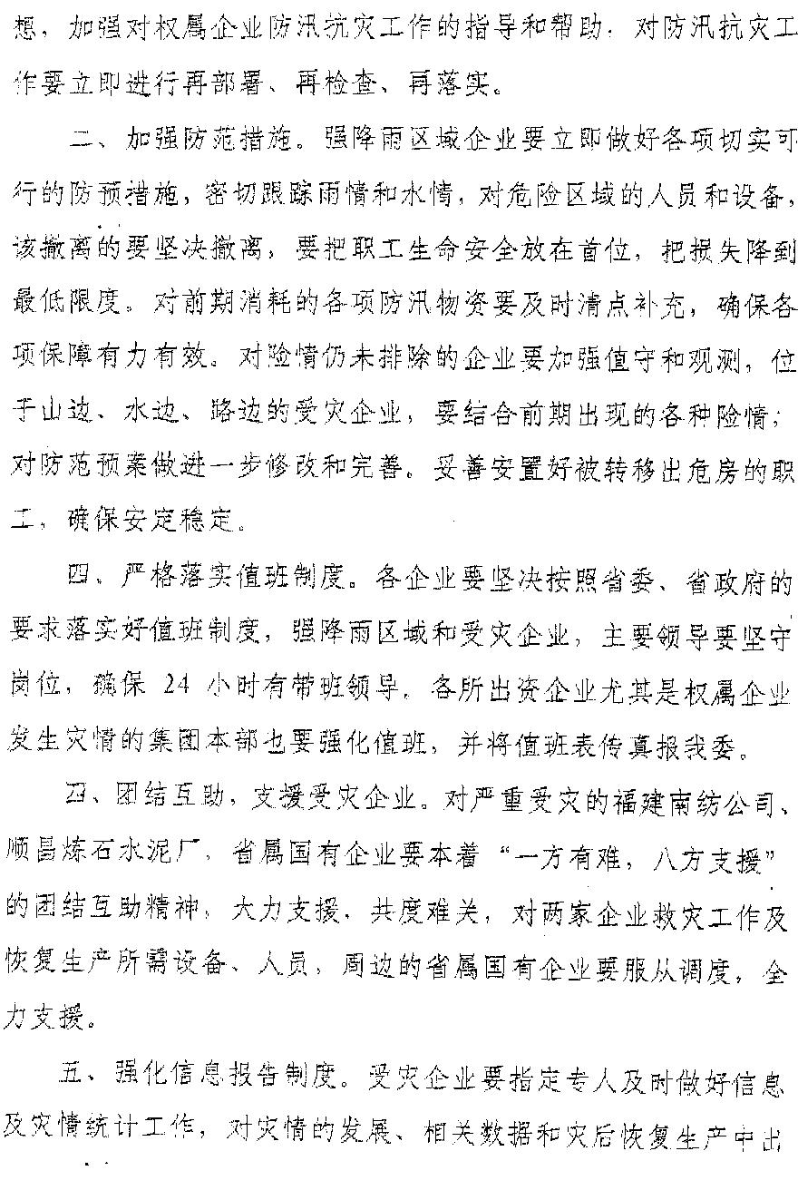 現(xiàn)將福建省人民政府國(guó)有資產(chǎn)監(jiān)督管理委員會(huì)《關(guān)于繼續(xù)做好汛期抗災(zāi)工作的緊急通知》(閩國(guó)資明電〔2010〕4號(hào))轉(zhuǎn)發(fā)給你們。各企業(yè)要認(rèn)真貫徹《通知》精神,堅(jiān)決貫徹省委、省政府關(guān)于防汛救災(zāi)的一系列部署,克服僥幸、麻痹、松懈思想,克服厭倦、畏難情緒,加大巡查力度,針對(duì)有可能發(fā)生的地質(zhì)災(zāi)害,要采取果斷措施,把職工群眾生命安全放在第一位,及時(shí)轉(zhuǎn)移人員和財(cái)產(chǎn),確保人員安全和財(cái)產(chǎn)損失降低到最低程度。