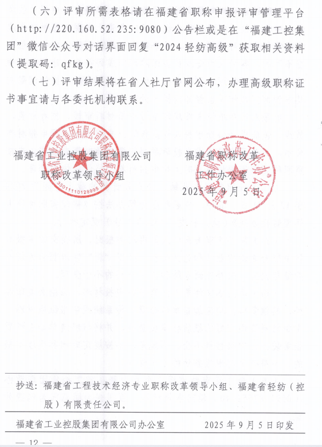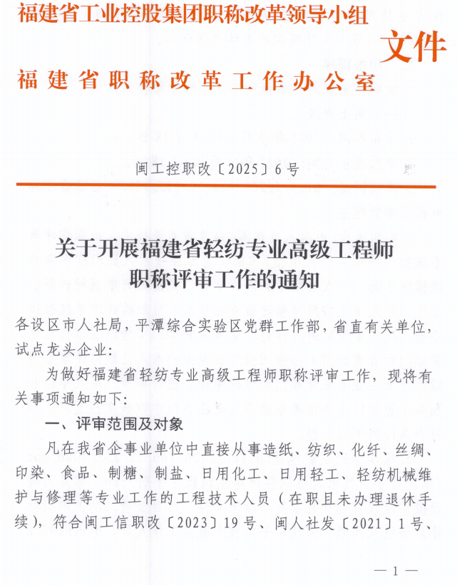 福建省工業(yè)控股集團(tuán)職稱改革領(lǐng)導(dǎo)小組福建省職稱改革工作辦公室文件-關(guān)于開展福建省輕紡專業(yè)高級(jí)工程師職稱評(píng)審工作的通知.pdf