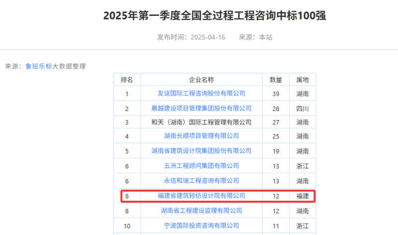 輕紡設(shè)計院在2025年第一季度全國全過程工程咨詢中標數(shù)量百強榜單中位列第8名