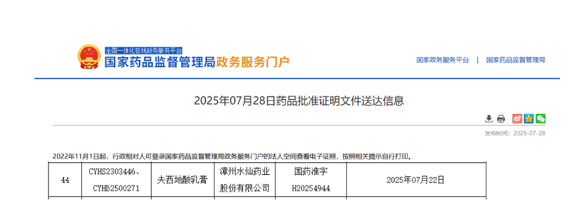 近日,水仙藥業(yè)新產品夫西地酸乳膏獲得國家藥品監(jiān)督管理局頒發(fā)藥品注冊批件,并視同通過一致性評價,預計于2025年10月投產并上市銷售。